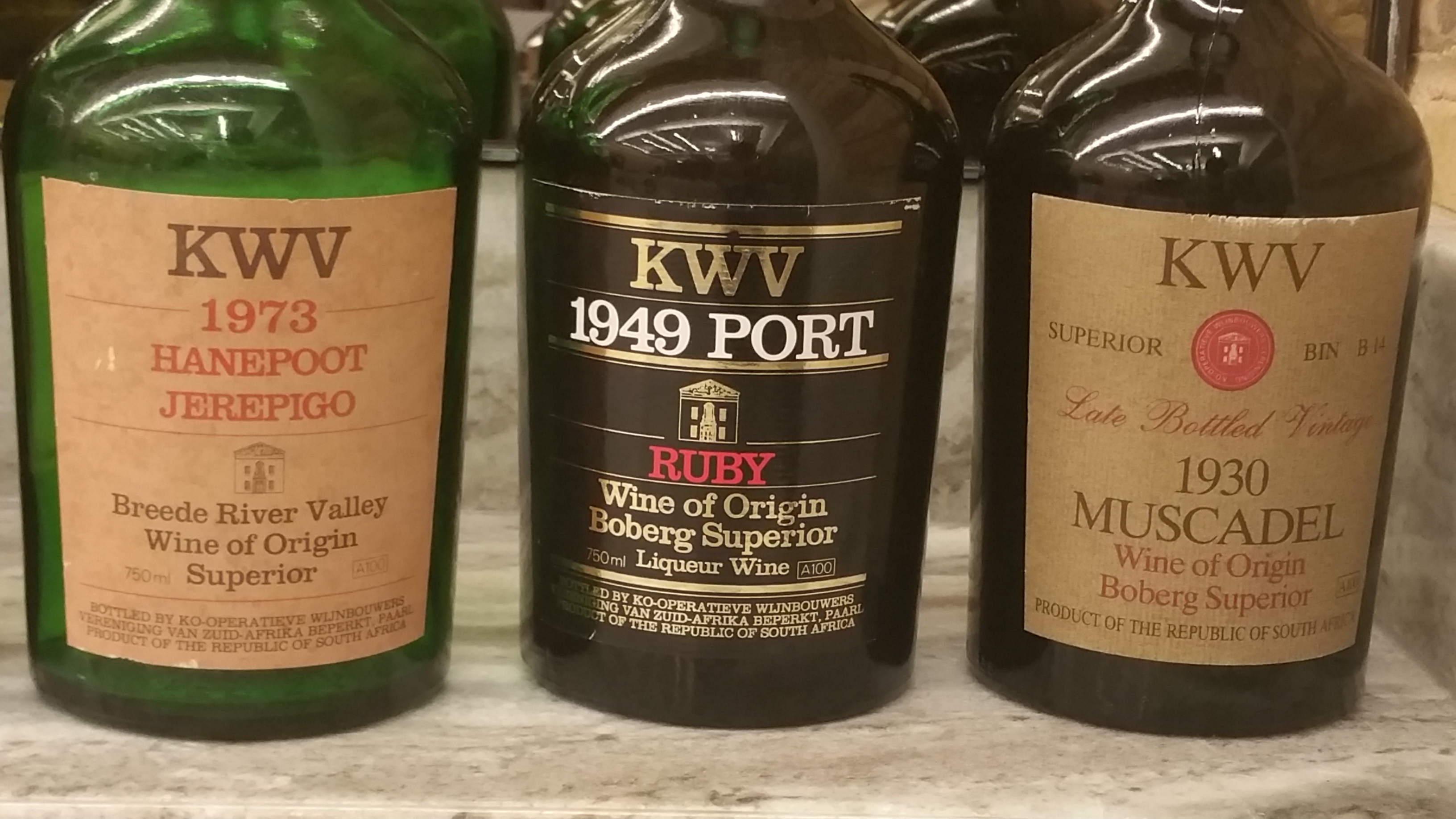 Sensational wines holding the test of times were the rare fortified jewels of the cooperative – KWV Muscadet Late Bottled Vintage 1930, WO Boberg Superior, KWV Ruby Port 1949, (Tinta Barocca and Souzau), WO Boberg Superior, and KWV Hanepoot Jerepigo Superior 1973 (Muscat of Alexandria), WO Breede River Valley.