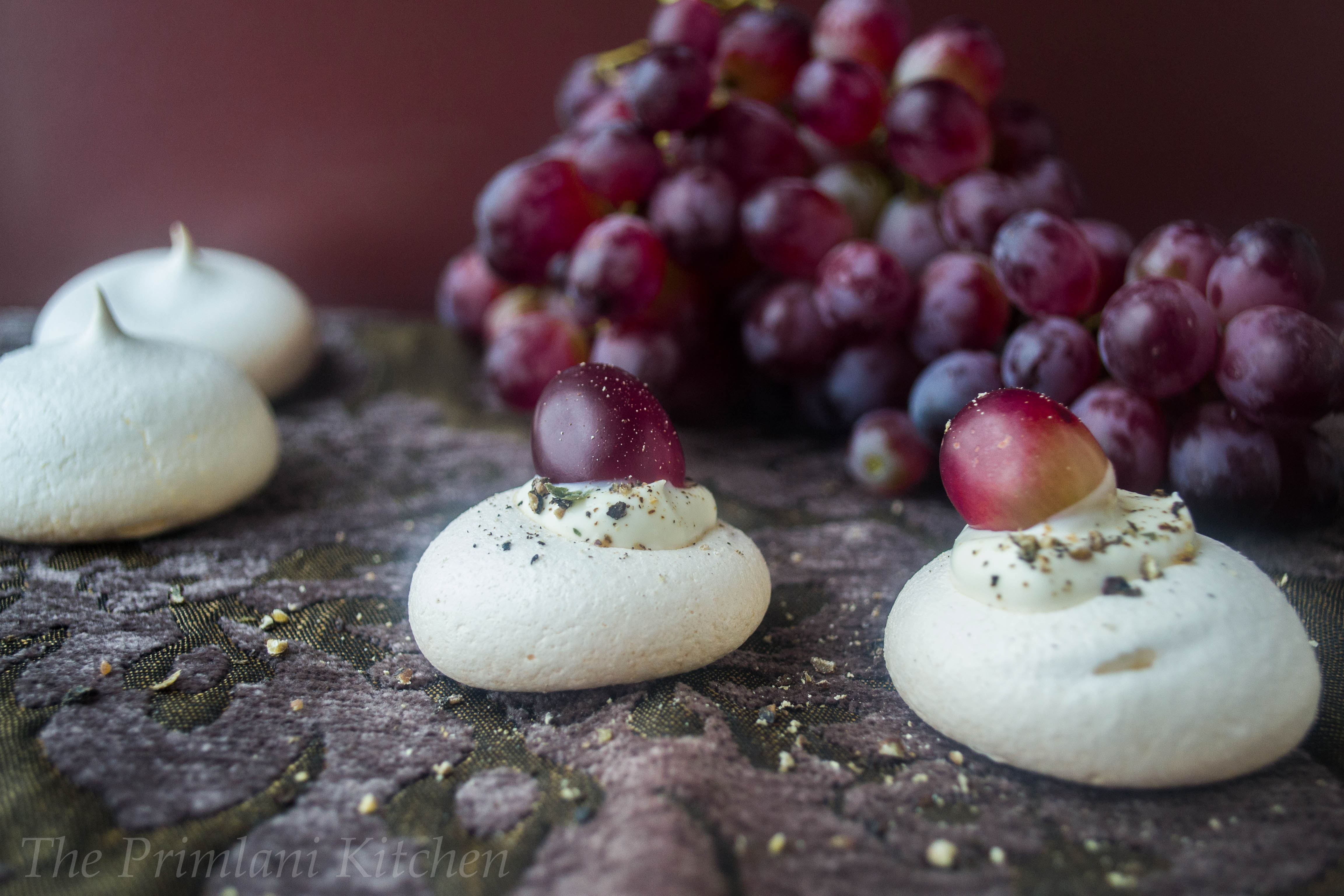 I called these mini clouds of decadence. Light and airy meringues topped with grapes roasted with honey, a dash of creme fraiche and the unexpected crunch from cracked black pepper; you won’t stop at 1.
