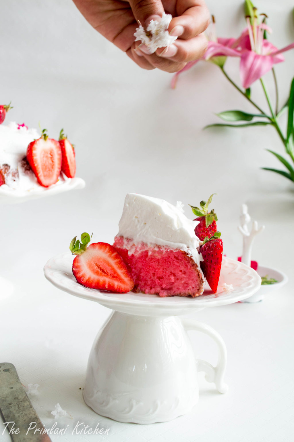 - Frost the cake with meringue frosting. Serve the cake chilled or at room temperature with sliced fresh strawberries.
