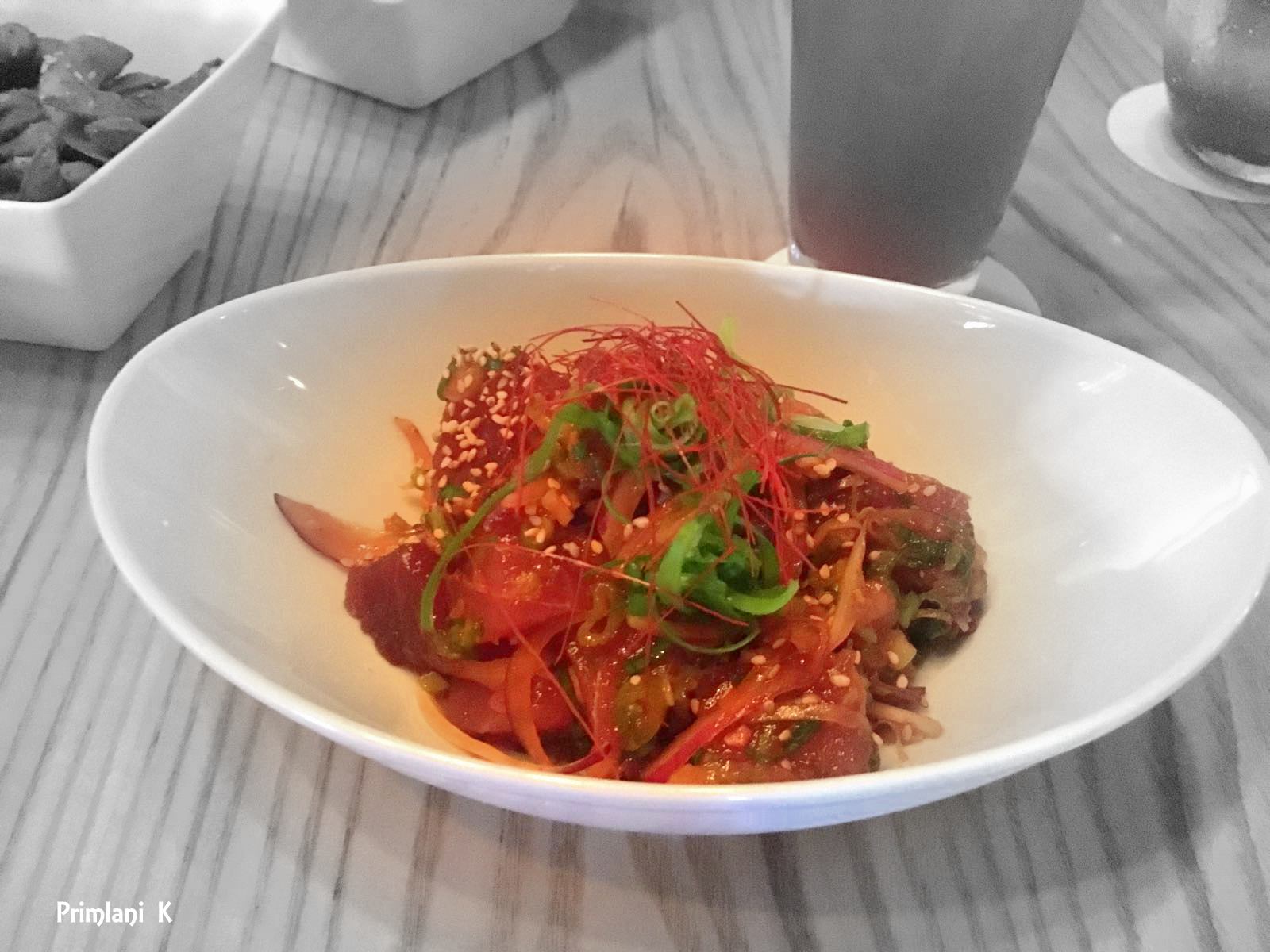 Ahi Poke: Yuhi’s hometown Hawaii classic pupu. Poke (pronounced poh-keh), a raw-fish salad, ubiquitous at family gatherings and parties across the islands maintains it’s simplistic character while focusing on high quality ingredients and clean flavors. Paired with a glass of chilled Summer Melon Patch – hanger one citrus vodka, watermelon juice, and lime juice, it was a refreshing respite from Florida heat and palate teaser to our indulgent evening to come.