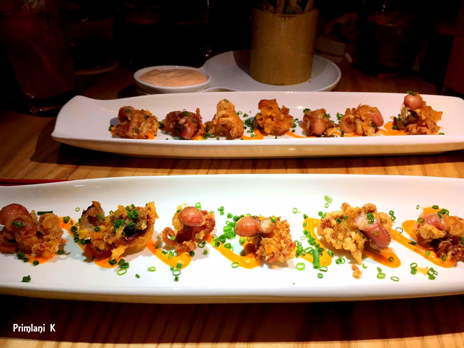 Iidako Karaage: (fried baby octopus) spicy mayo. Fried food, a hallmark of bar snacks – crunchy and salty, is just about the perfect bite to introduce to your palate between sips of cold beer, or in Morimoto Asia’s case, chilled sake cocktails. Lightly fried baby octopus dipped in spicy mayo, how can one go wrong?