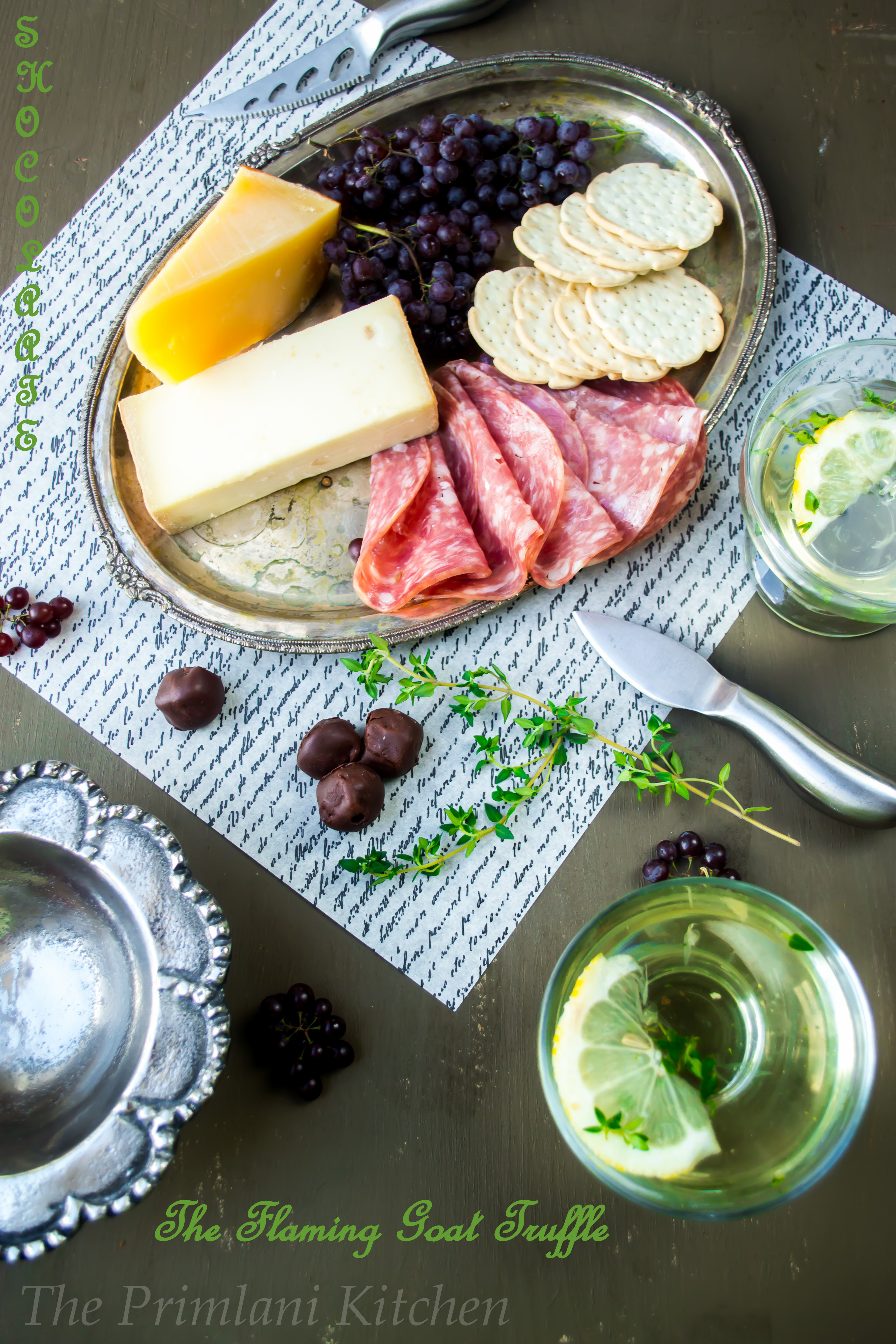 I wanted to compliment the flavors of these truffles with dishes which enhance the overall experience by allowing the respective flavors to stand out. Since the Flaming Goat Truffle was laced with spicy pepper, I chose it as a starter. Cocktail/Tasting parties around the world have featured cheese as truffle’s favorite friend. Bold, rich, flavorful; these are a few adjectives that apply to both chocolate and cheese. So why not combine both to create the ultimate party?