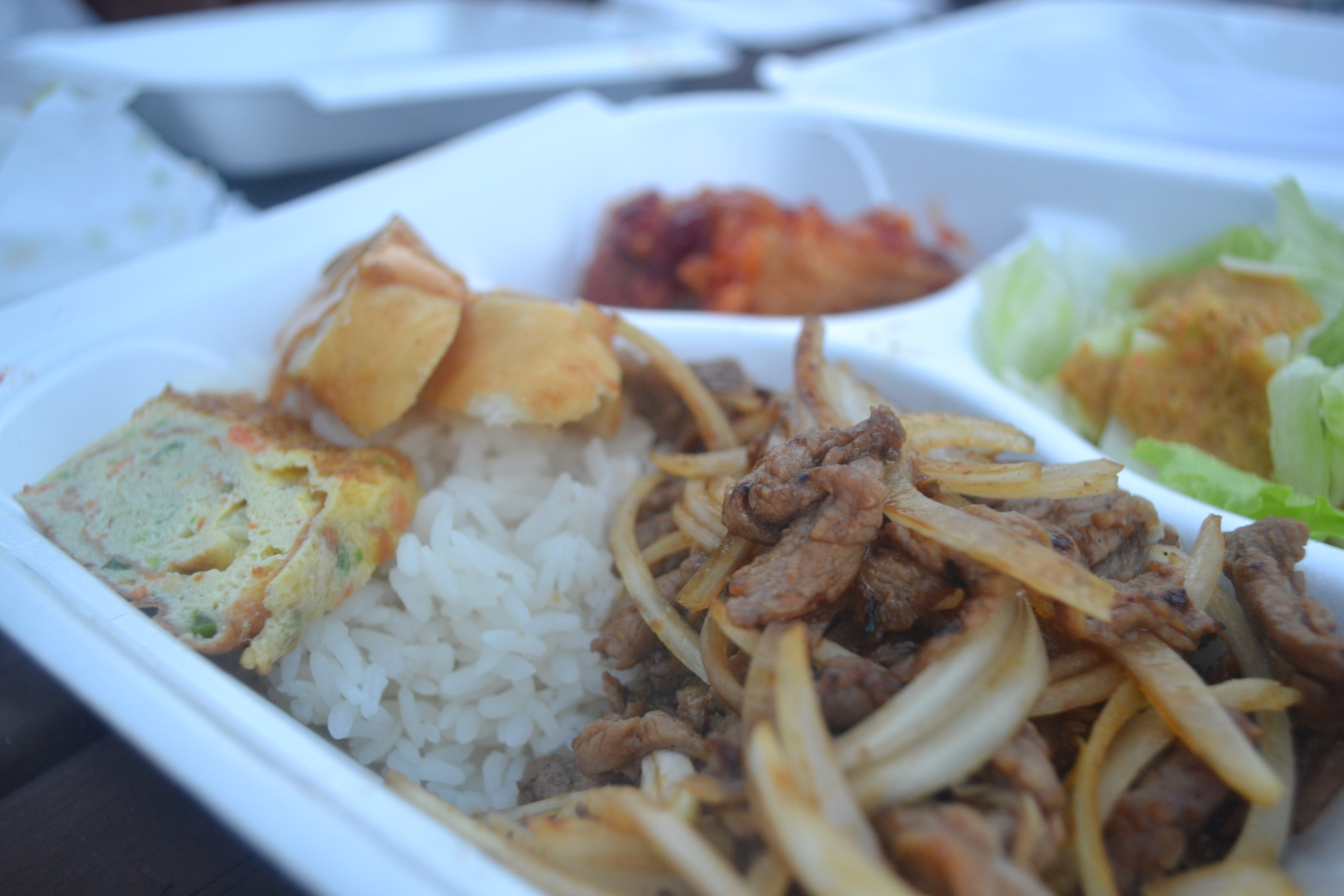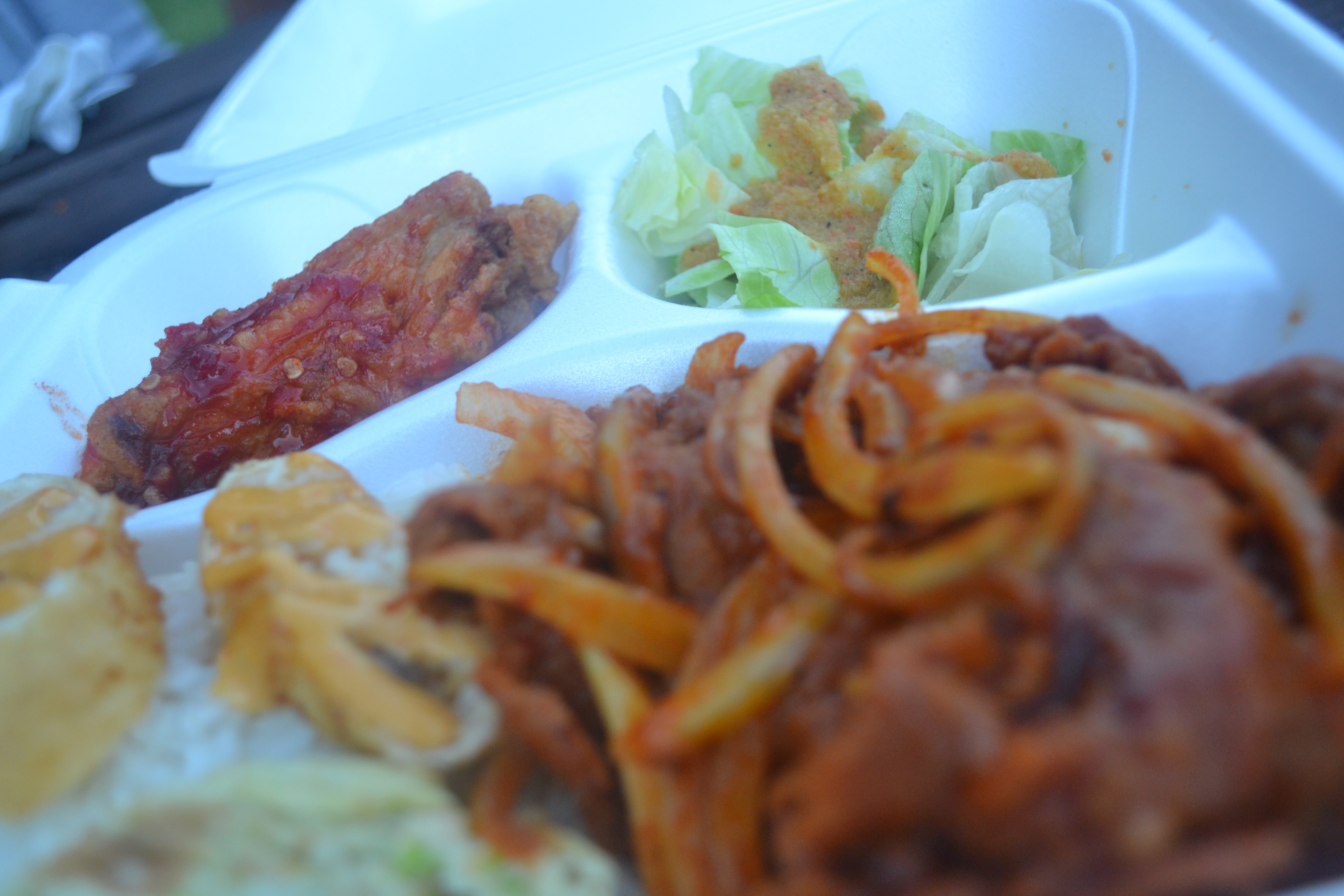 I used the time while waiting for my meals to browse the photograph based menu posted in front of the yellow truck. All Box meals came with a salad dressed in a house ginger dressing and Korean side dishes: 1 spicy chicken wing, 2 pcs fried cheese roll, fried tofu with teriyaki sauce, and 1 pc of egg omelet roll. Hmm, that is a wholesome meal in itself, certainly the largest portions in comparison to rest of the truck offerings. The reasonable pricing was similar to lunch fare offered in most South East Asian Restaurants.