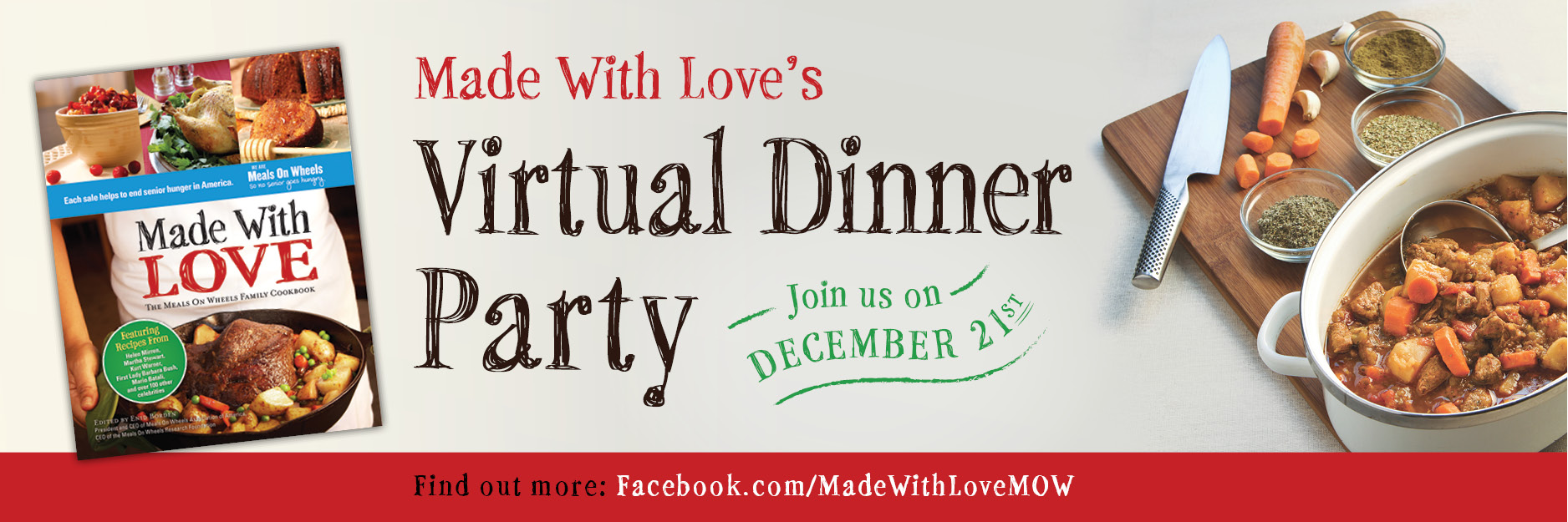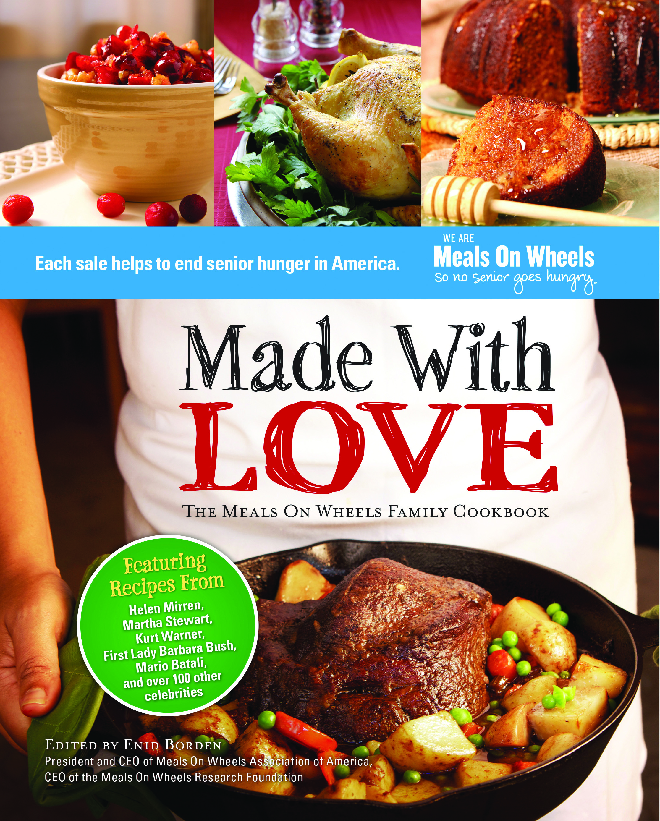 About Made with Love: Providing more than one million meals a day for seniors across America, Meals On Wheels Association of America is the oldest and largest national organization of its kind. Over 100 celebrities have come together in Made With Love: The Meals On Wheels Family Cookbook (BenBella Books, October 2012) to help the organization’s fight to end senior hunger in America. Made With Love includes recipes from the tables of well-known actors, chefs, athletes, writers, and other celebrities. Celebrating the importance of families coming together to help others in need, the cookbook also includes personal stories about the contributors’ favorite family meals. Contributors include Paula Deen, Helen Mirren, former First Lady Barbara Bush, Mario Batali, Martha Stewart, Kurt Warner, Dr. Maya Angelou, Joan Rivers, Patti LaBelle, Cokie Roberts, Al Roker, Judi Dench, and many more. With Made with Love, step inside the kitchens of your favorite celebrities, meet their families, and help to feed seniors in need.