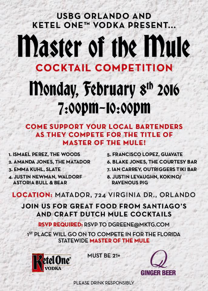 Ms. Cowan, Ketel One Vodka Regional Brand Ambassador. US East recently hosted the 1st Master of the Mule Cocktail Competition with USBG Orlando and Ketel One Vodka in Orlando. First place twist on the Ubiquitous classic crispy and refreshing, food friendly cocktail Moscow Mule earned bragging rights and a chance to compete for the Statewide Master of Mule Title.