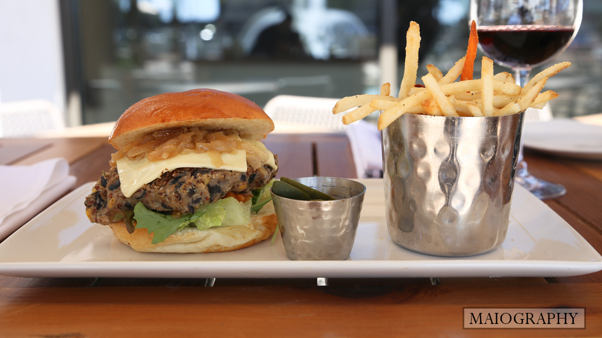Quinoa & Black Bean Burger: White American cheese, tomato jam, caramelized onions, greens, and pickles. A veggie burger that celebrates its veggie-ness while being complemented with the classic fixins and condiments we have come to expect from all our hand-held bites. A burger that even a carnivore would appreciate with or without bacon.