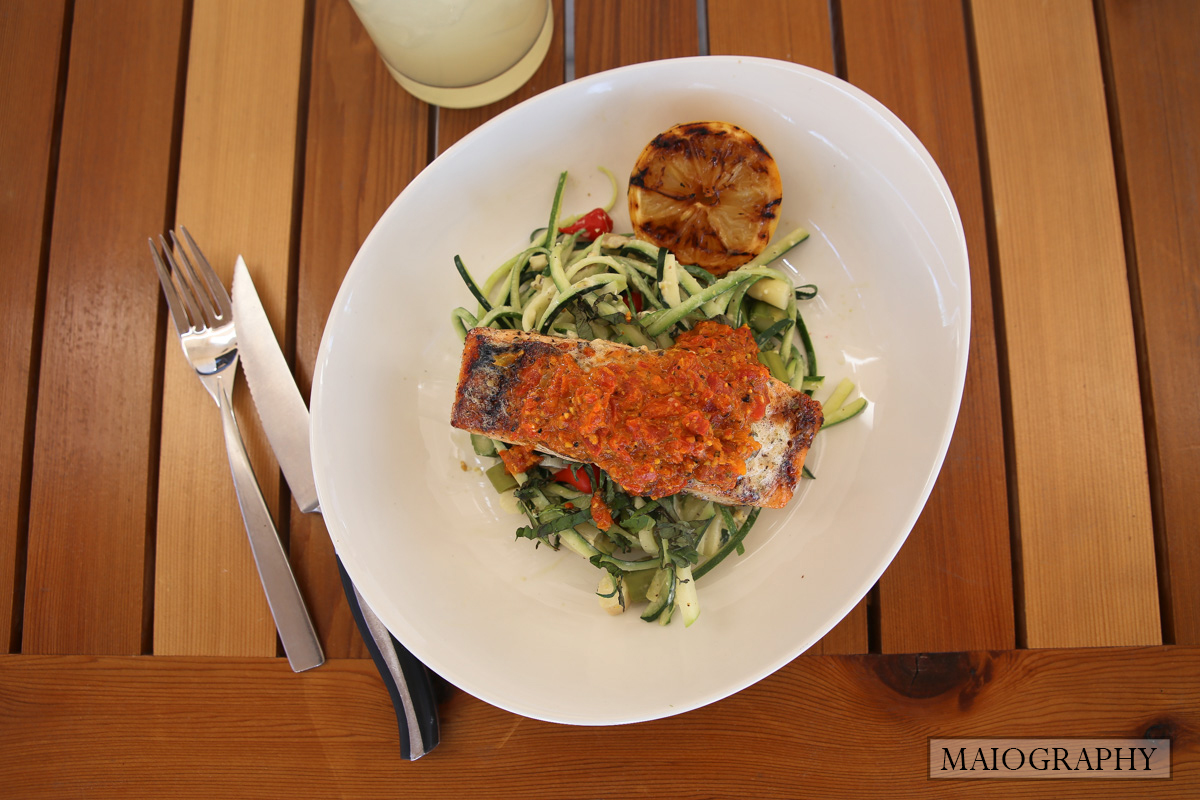 Salmon & Zoodles: Zucchini pasta, asparagus, sweet drop peppers, green apples, Feta cheese, pistachio Romesco sauce. Perhaps the only restaurant in town to serve a “feel good” dish that is great for your taste buds and body. Bravo Chef Bob!!